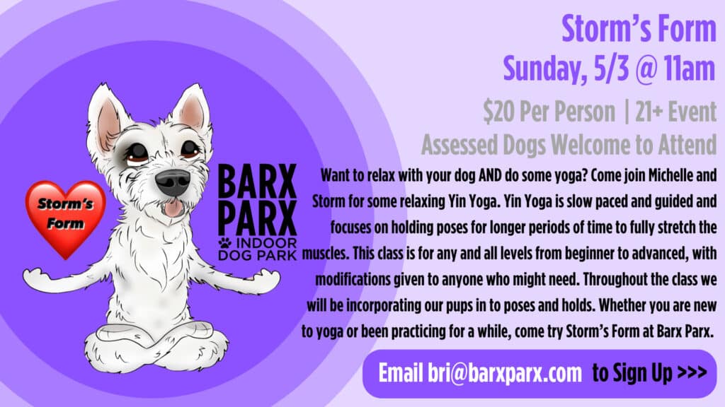Come join Michelle and Storm for some relaxing Yin Yoga. Yin Yoga is slow paced and guided and focuses on holding poses for longer periods of time to fully stretch the muscles. This class is for any and all levels from beginner to advanced, with modifications given to anyone who might need. Throughout the class we will be incorporating our pups in to poses and holds. Whether you are new to yoga or been practicing for a while, come try Storm’s Form at Barx Parx.